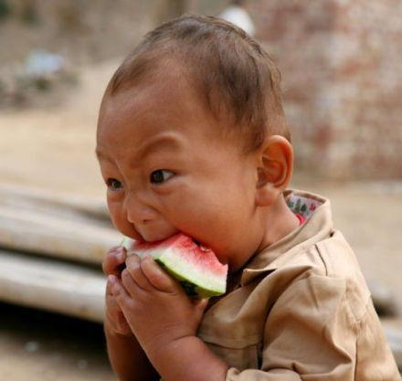 这张照片里的男孩,大约三四岁的样子,圆圆的小脸蛋上洋溢着灿烂的笑容。他坐在一张小桌子前,手里拿着一块大西瓜,正吃得津津有味。镜头捕捉到了他专注的眼神、满足的表情,还有那双灵动的手指,轻轻地在西瓜上划过,仿佛在探索这个美味的世界。